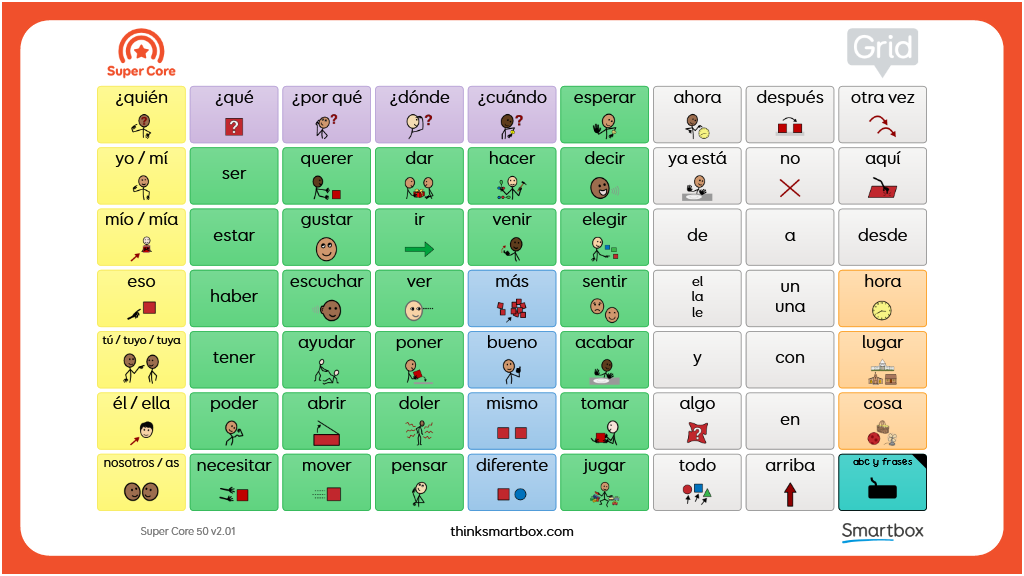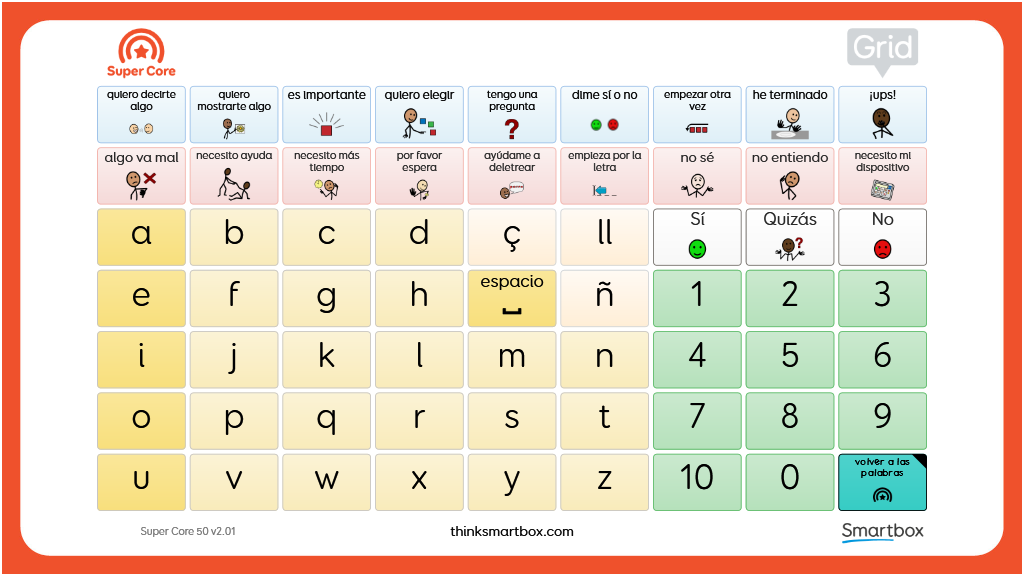 Tablero de comunicación imprimible a doble cara diseñado para su uso junto con el vocabulario de Super Core 50. Consta de dos cuadrículas: la primera incluye todas las palabras de la cuadrícula principal de Super Core, además de otras palabras núcleo, con el fin de proporcionar acceso a las palabras de uso más común y frecuente. La segunda cuadrícula contiene letras, números y frases útiles, extraídas también de Super Core 50. v2.01