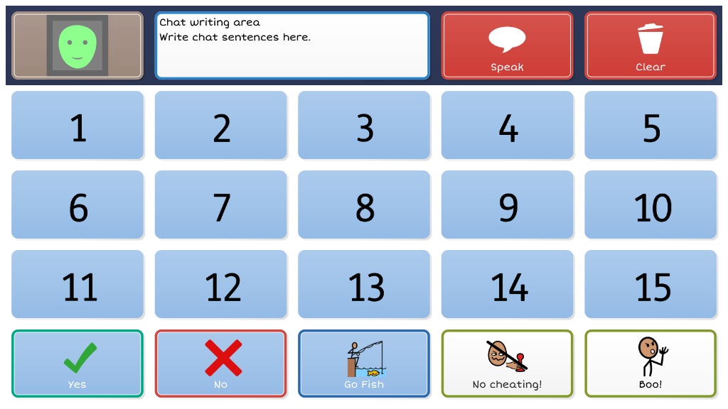 To be used in conjunction with playing cards. This grid set supports students who use eye gaze in playing a game of Go Fish with a peer. Individual cards can be hidden if the student is working on a smaller set of numbers.