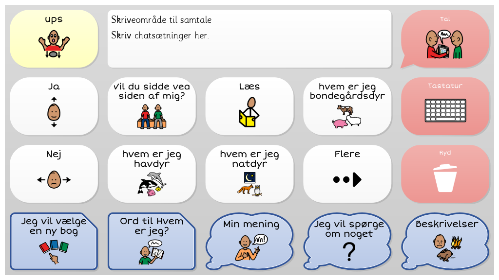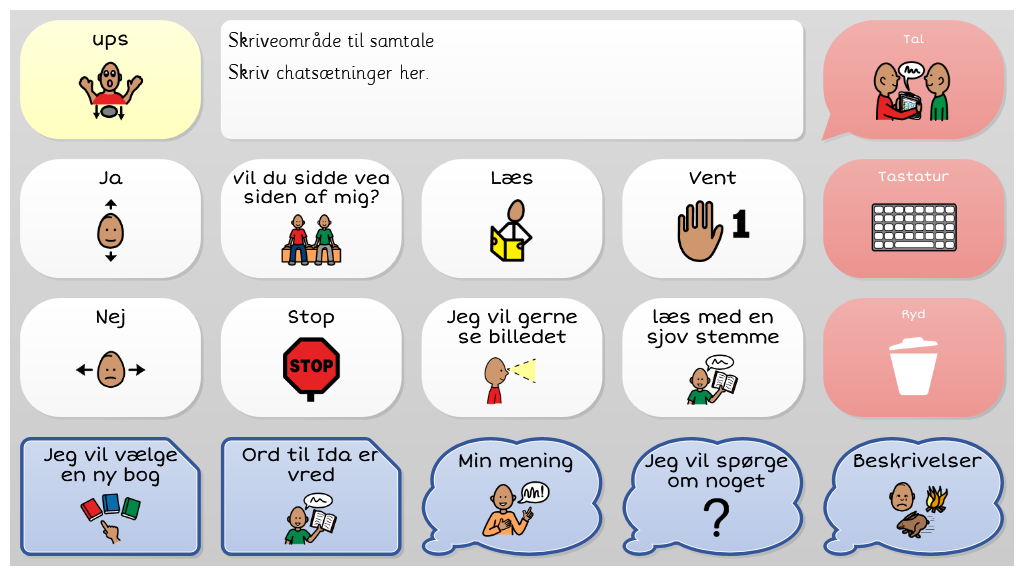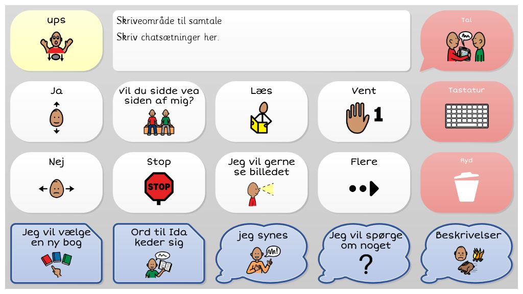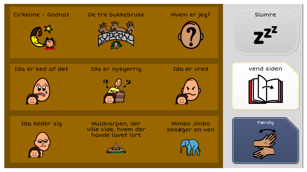 Dette sidesæt rummer ordforråd til at snakke om forskellige børnebøger. Ordforrådet stammer fra lav teknologiske kommunikationstavler lavet af medlemmer af TAVS gruppen i forbindelse med dagen Læs, lyt og forstå - alternativ vej til bøgernes verden.