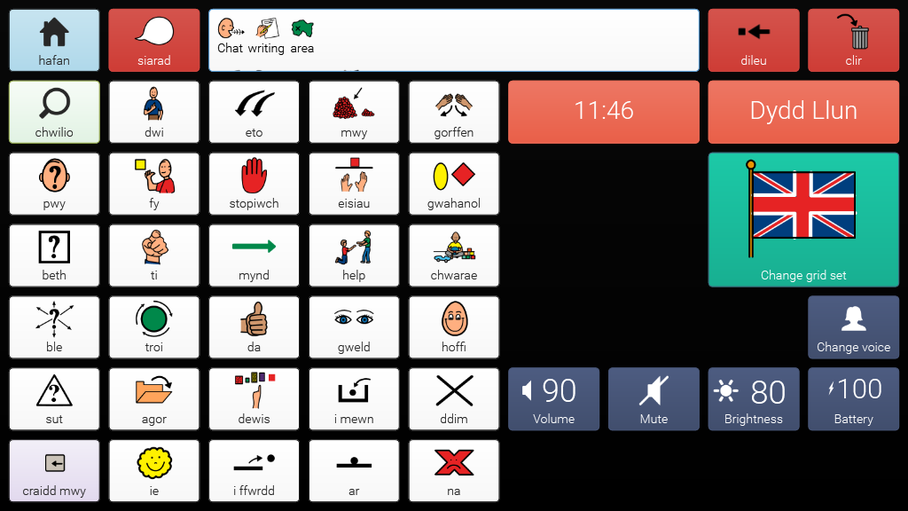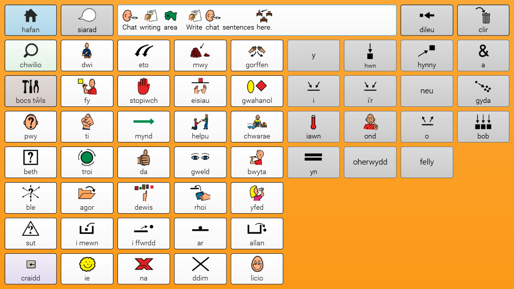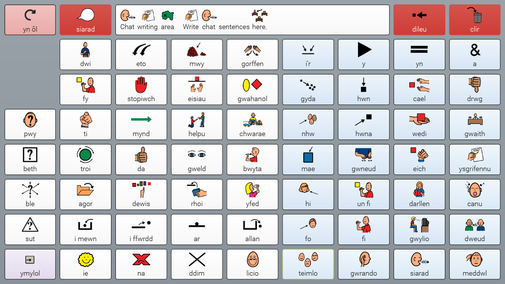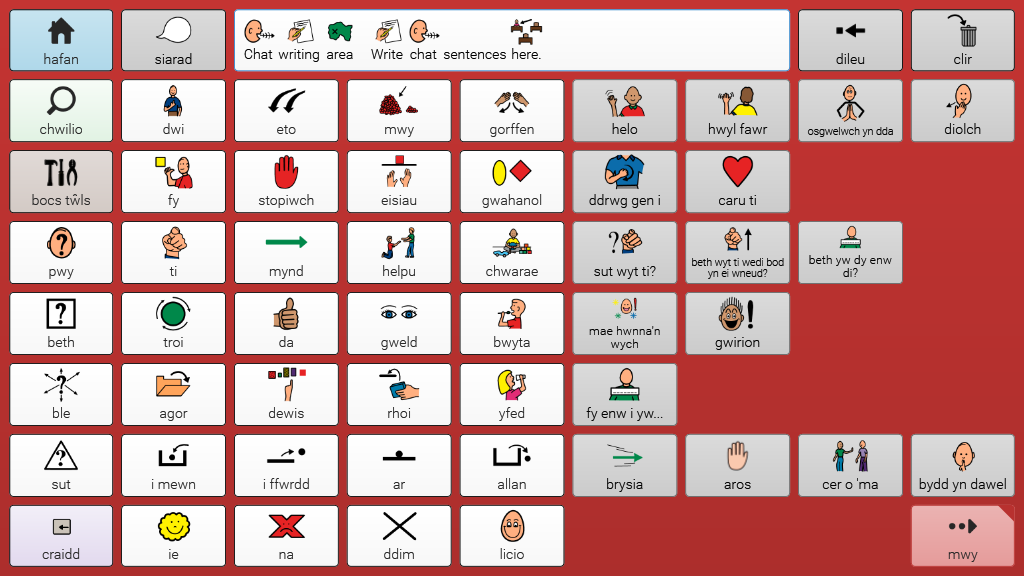 Welsh language core word symbol-based communication. To use the Bilingual system you will also need to download the English version, 'Come & Chat'. *Version 2.0 (February 2026)