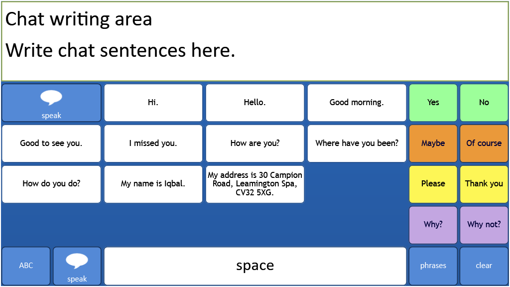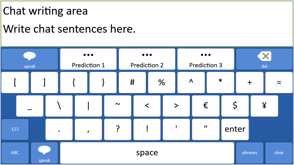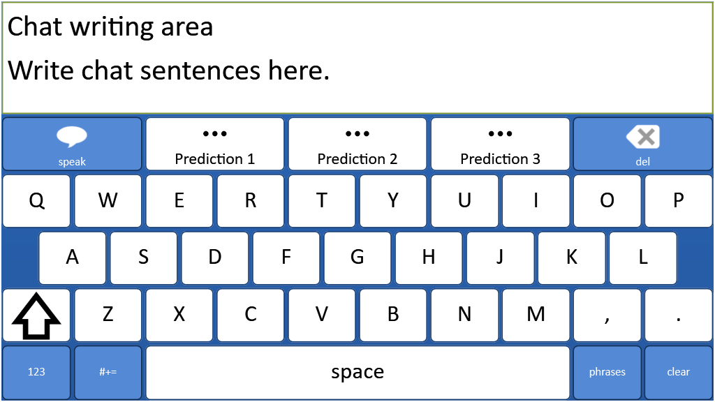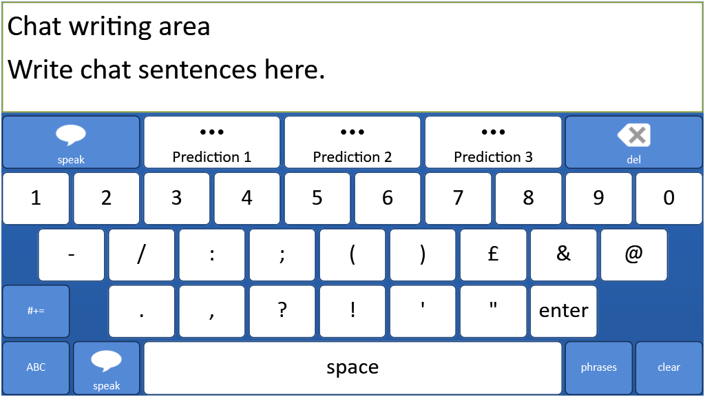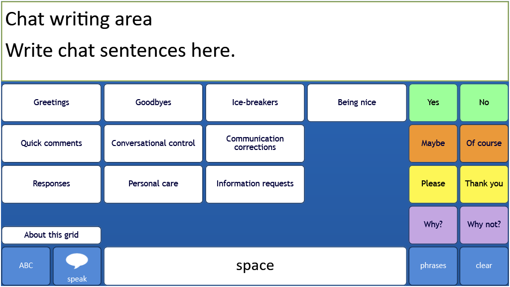 A text based communication system for literate users. Text Talker includes prediction and a ready made bank of instant messages. This version is the old Grid 2 gridset modified using Grid 3. It is specificially intended for use on the iPad using Grid Player.
