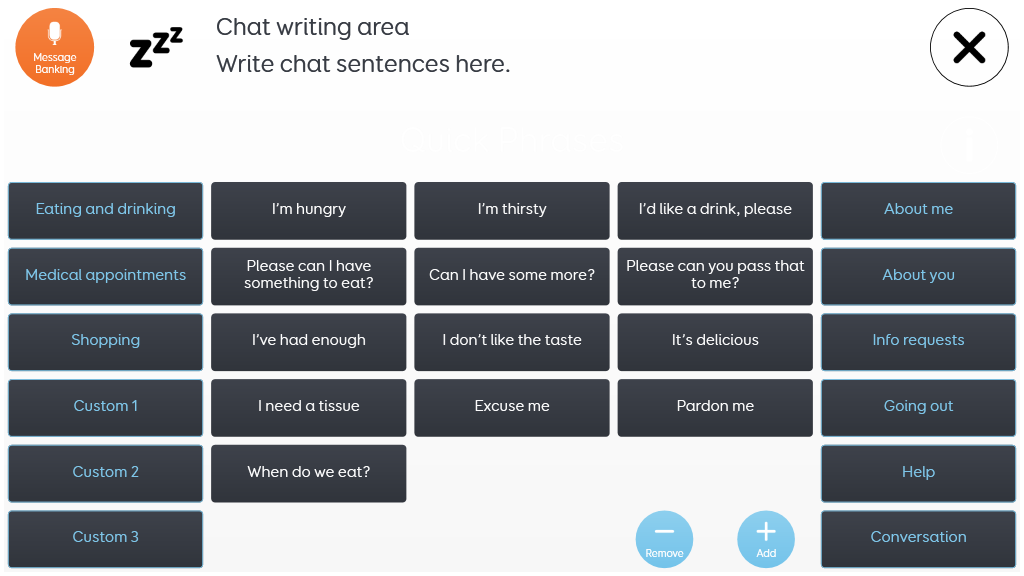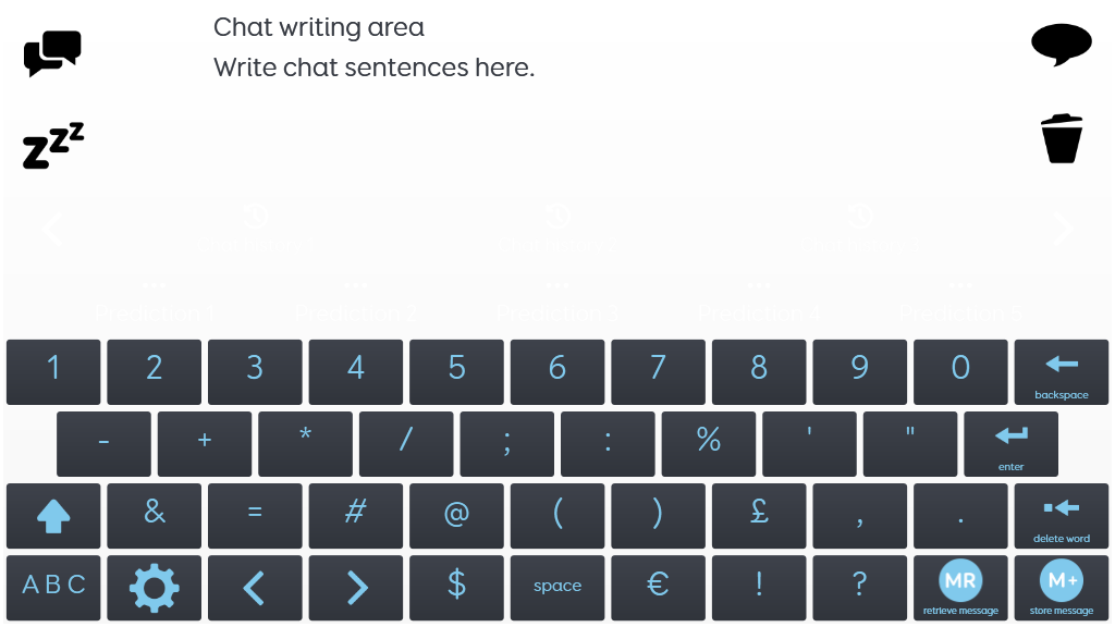 A text communication grid set for fast and efficient message generation. Incorporating word prediction, chat history, pre-stored phrases and message banking. A memory function allows you to store a phrase with a single selection, and recall it later with two selections - for handling interruptions, holding two conversations at once, or preparing for a conversation in advance. QWERTY, ABC or scanning keyboard layouts can be selected from the settings grid. v2.1
