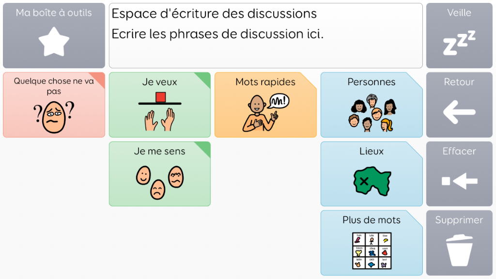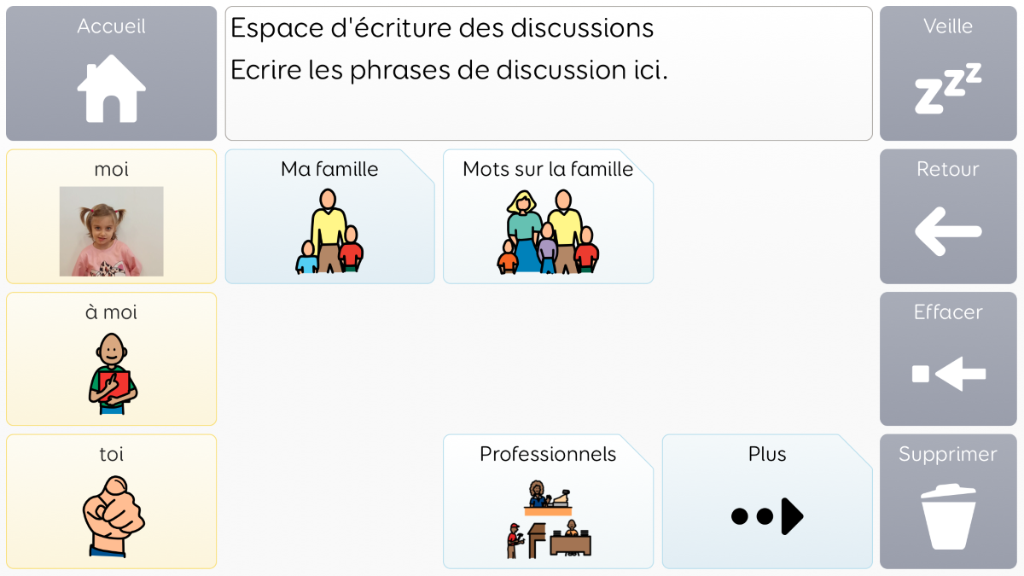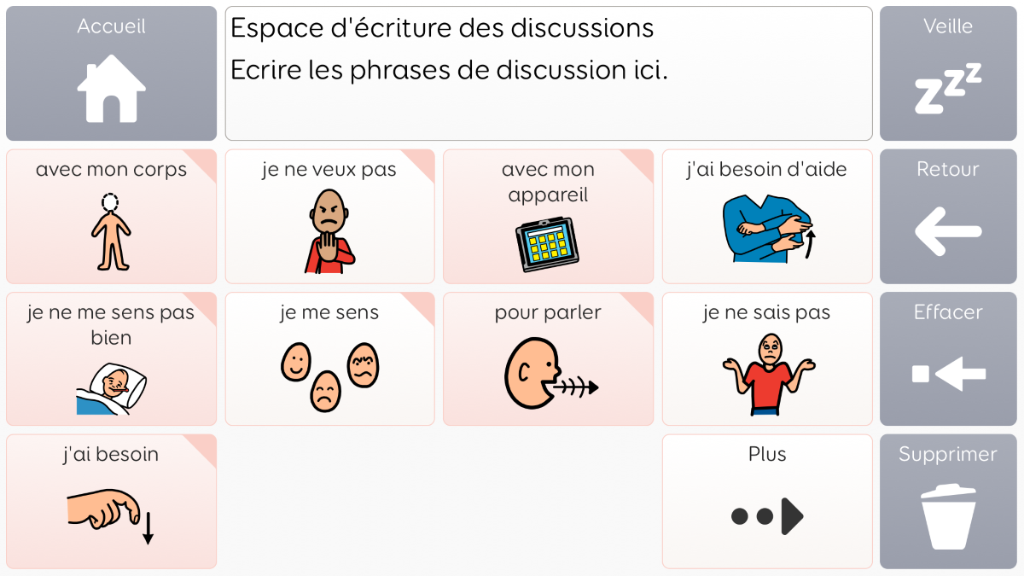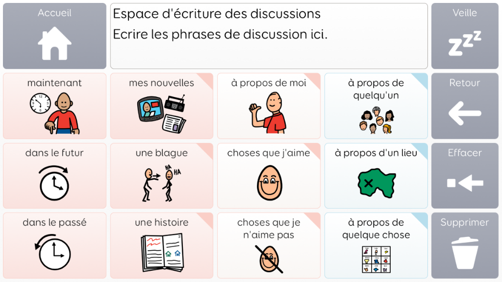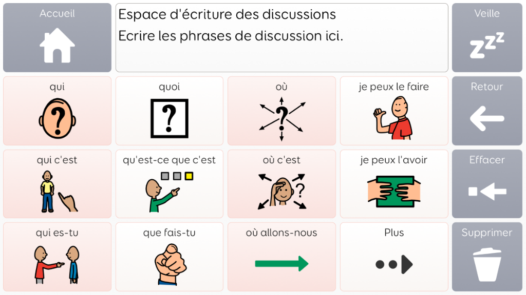 Voco Chat est un vocabulaire de symboles à faible nombre de cellules, qui permet aux utilisateurs de communiquer dans de nombreuses situations. Les voies de message (avec des sauts intégrés et un vocabulaire soigneusement sélectionné) offrent un système formel de la langue. L'ensemble de pages comprend des ressources pour soutenir la communication et le bien-être émotionnel, notamment avec des applications comme Symoji et Appareil photo pour favoriser l'interaction et l'engagement. Voco Chat convient à tous ceux qui ont besoin de cellules plus grandes, et peut être utilisé avec le toucher, la commande oculaire, le pointeur et les contacteurs. Des invites auditives sont incluses pour les colonnes et les cellules individuelles. Lorsque vous ajoutez Voco Chat pour la première fois, vous pouvez sélectionner « Enfant » ou « Ado et adulte » afin de choisir le vocabulaire le plus approprié pour l'utilisateur. v1.04