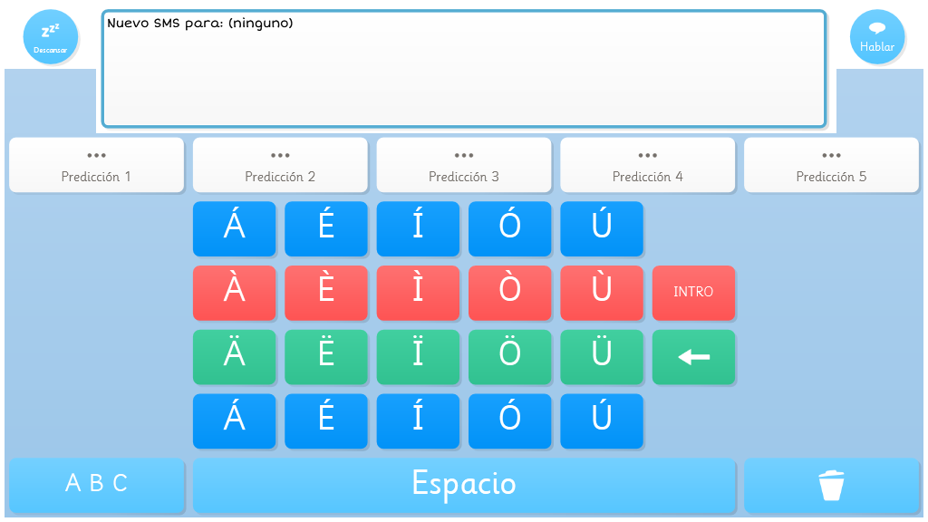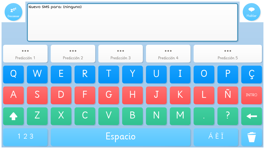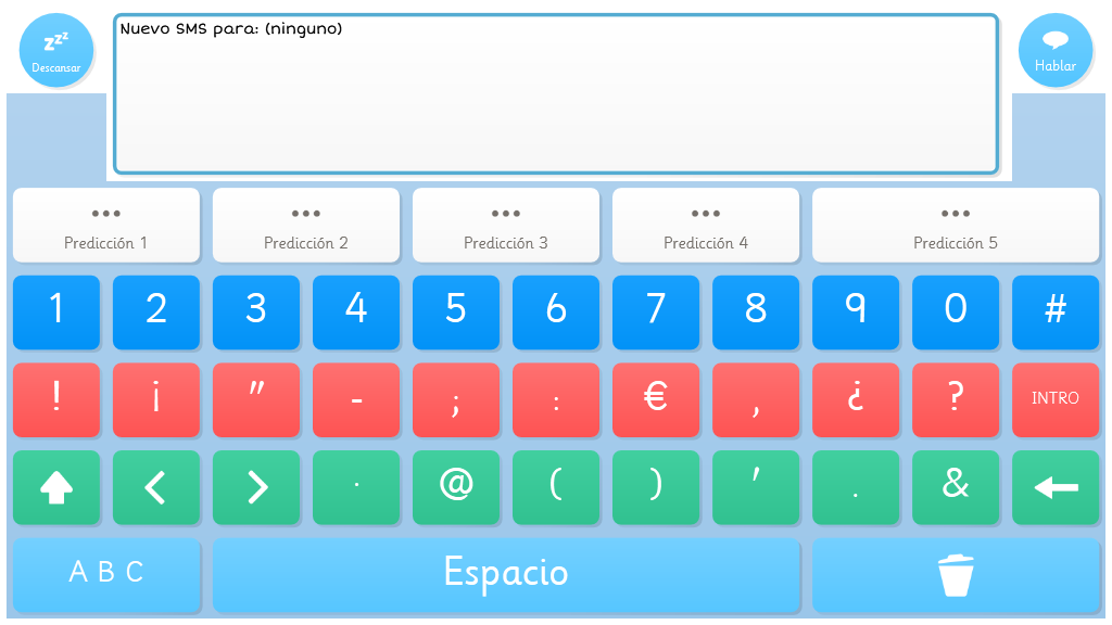 Teclado sencillo con teclas de colores y celdas de predicción con símbolos.