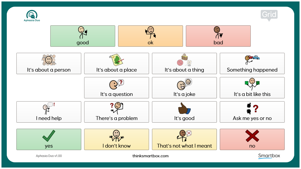 A grid set designed to complement our Aphasia Duo vocabulary. Print double sided and laminate for a portable version of chat help and keyboard. v1.00
