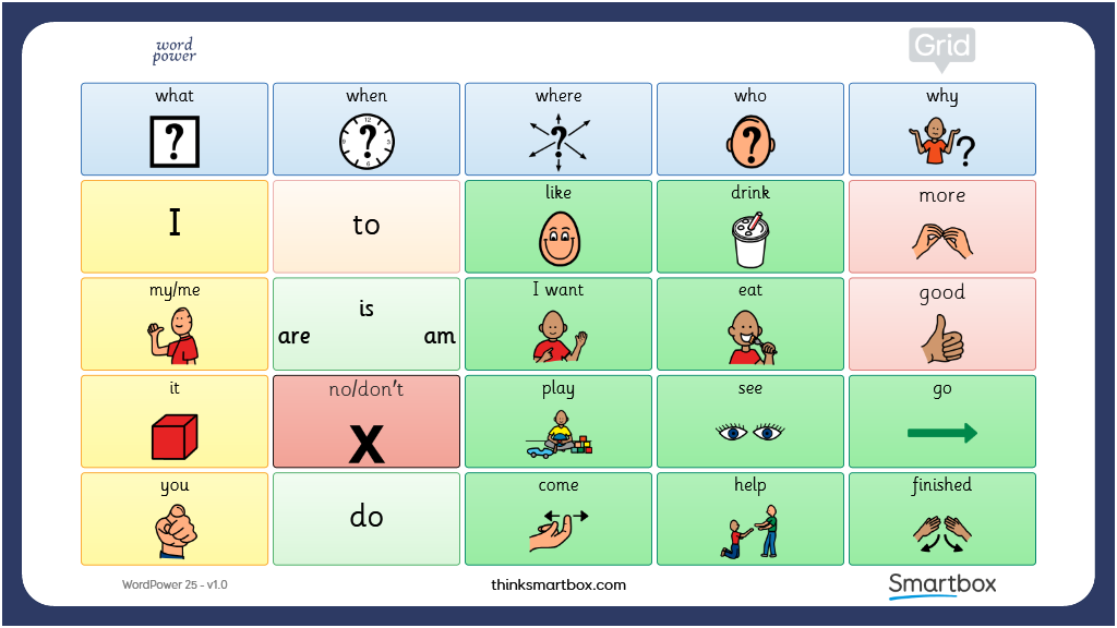 A version of WordPower 25 by Nancy Inman, using PCS symbols. Designed for printing out to act as a low-tech alternative when a communication device is unavailable. Can also be used alongside a communication device for modelling language.