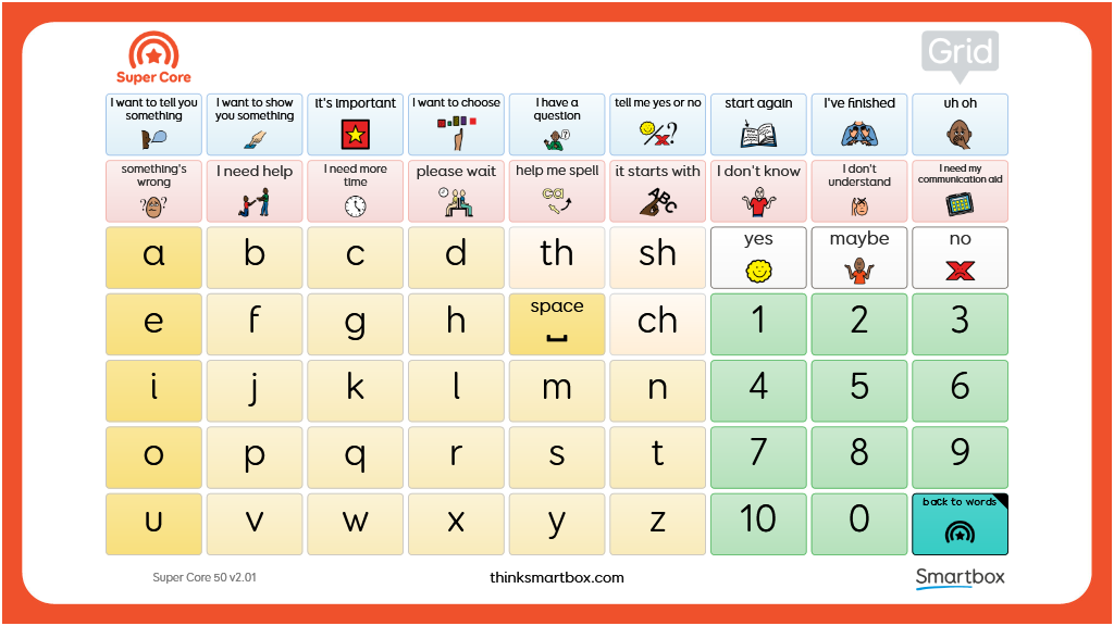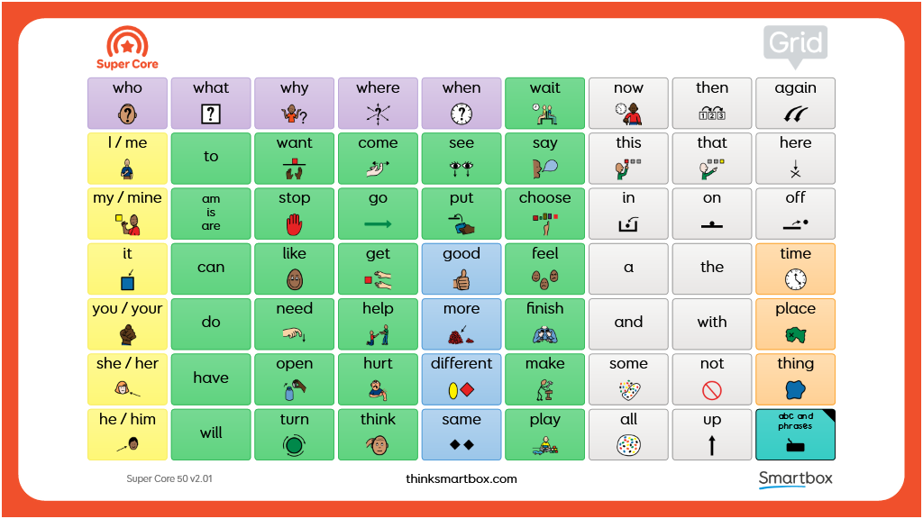 A printable two-sided communication board designed to be used alongside the Super Core 50 vocabulary. Consisting of two grids, the first includes all of the words from the Super Core home grid, plus additional core words, to give access to the most functional and frequently used core words. The second grid consists of letters, numbers, and useful phrases, also taken from Super Core 50. v2.01