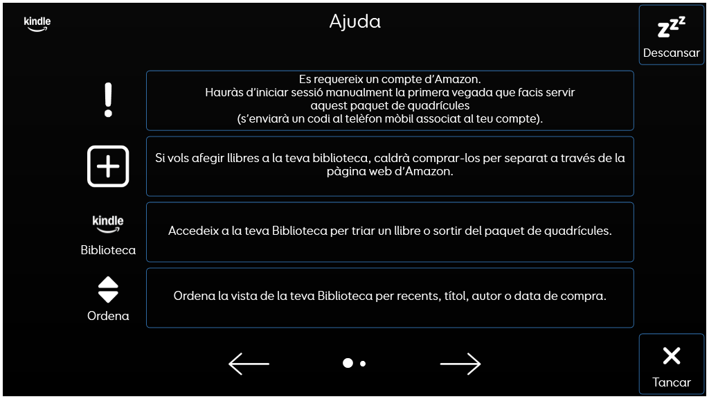 Accedeix a la plataforma web d’Amazon Kindle per llegir llibres Kindle directament des de Grid 3. Explora la teva biblioteca i comença a llegir! És necessari tenir un compte de Kindle. Aquest paquet de quadrícules funciona només com a lector; per comprar nous títols cal utilitzar un navegador estàndard. v1.0