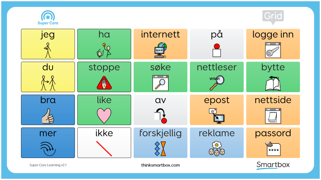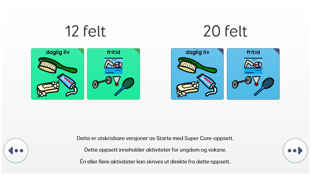 Starte med Super Core oppsettet tilbyr en forsiktig progresjon til hele Super Core oppsettets ordforråd. En mulighet til å bygge selvtillit med symbolbasert ASK. Det inkluderer alle de "daglige" og " lek aktivet" ordene fra Super Core, sammen med et forenklet kjernevokabular med et lavere felt antall på 12 og 20 felter. v2.1