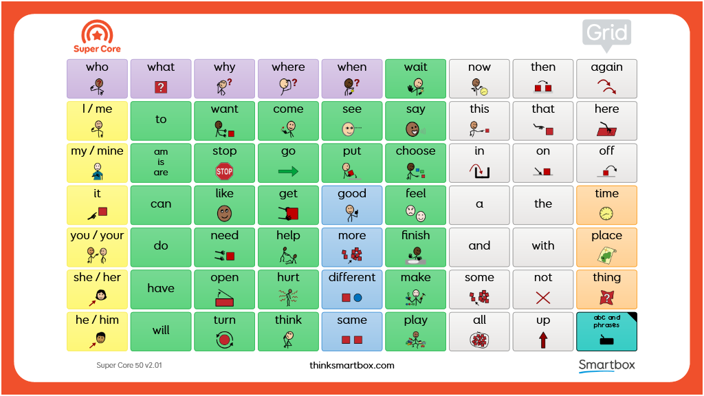 A printable two-sided communication board designed to be used alongside the Super Core 50 vocabulary. Consisting of two grids, the first includes all of the words from the Super Core home grid, plus additional core words, to give access to the most functional and frequently used core words. The second grid consists of letters, numbers, and useful phrases, also taken from Super Core 50. v2.01