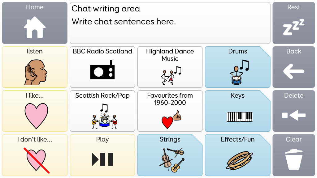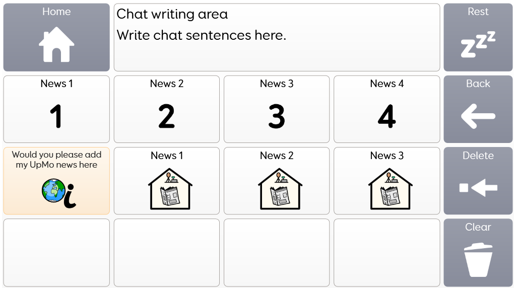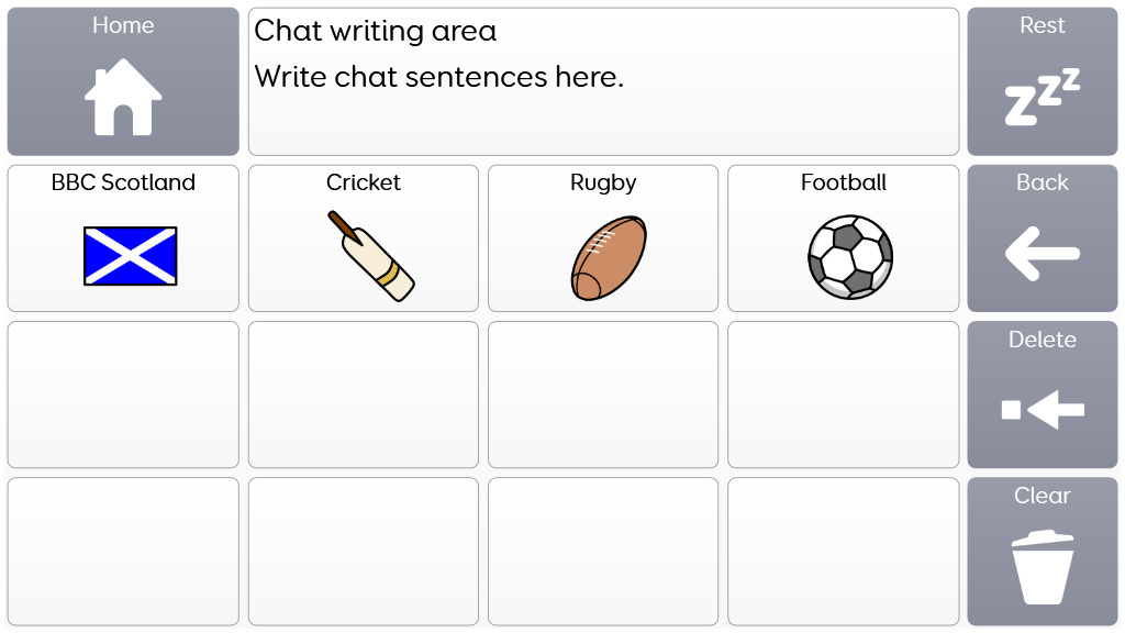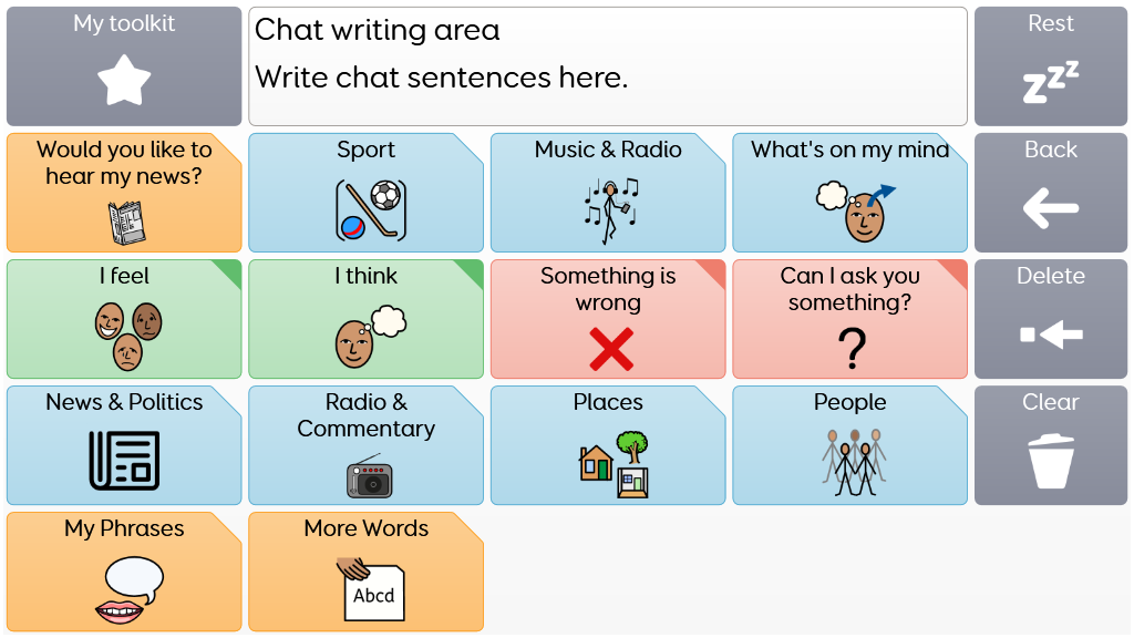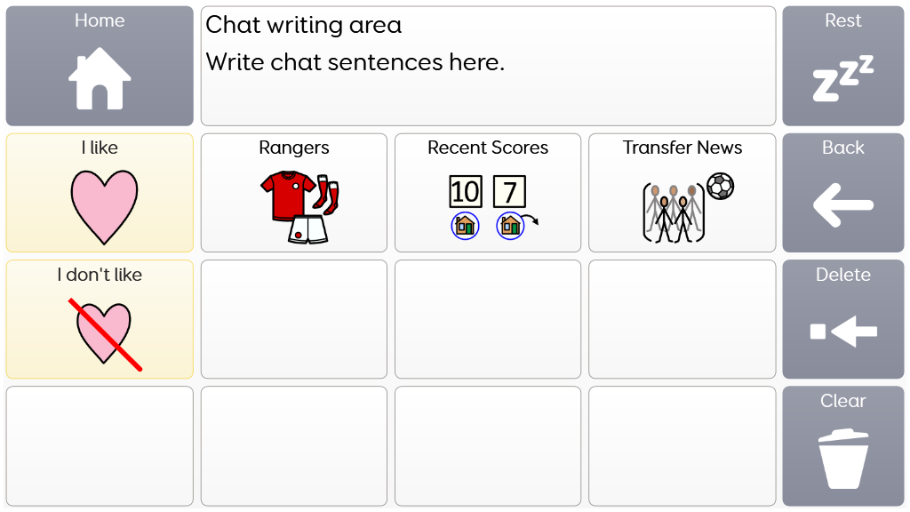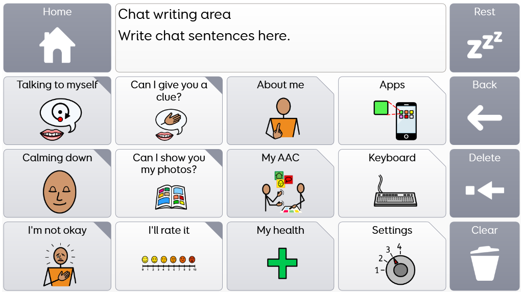 Voco Chat is a low-cell count symbol vocabulary, designed to enable users to communicate for a wide range of reasons. Message pathways, with built-in jumps and carefully selected vocabulary, provide a supported approach to language. The grid set includes resources for supporting communication and emotional wellbeing, with apps such as Symoji and Camera to support interaction and engagement. Voco Chat is suitable for anyone who needs larger cells, and can be used with touch, eye gaze, pointer and switches. Auditory prompts are included for both columns and individual cells. When you add Voco Chat for the first time, you can select either ‘Child’ or ‘Teen and Adult’ in order to choose the most appropriate vocabulary for the user. v1.05