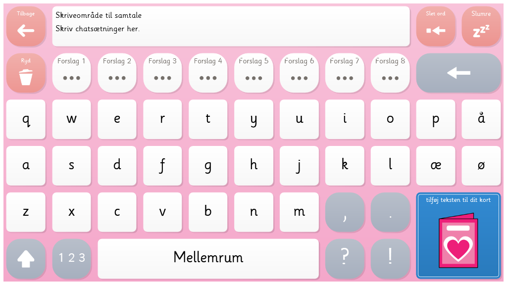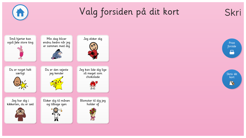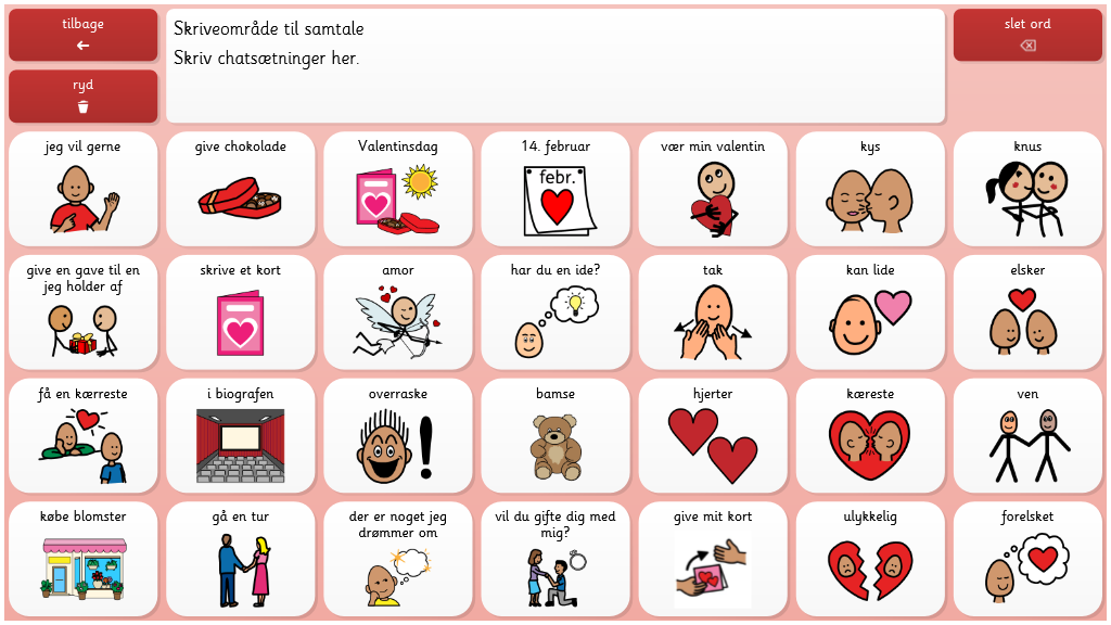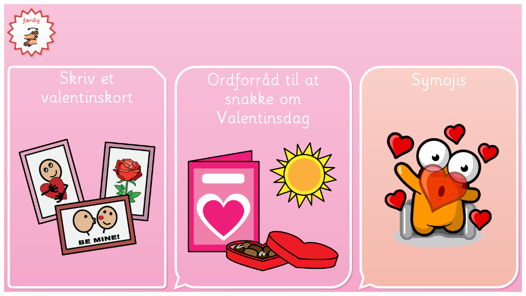 I dette sidesæt kan du lave et valentinskort. Vælg en forside, vælg en tekst eller skriv den selv ved hjælp at tastaturet, print ud og klip. Giv den til en du holder af. I sidesættet kan du også bruge de søde symojis, og snakke om valentinsdag, om hvad du gerne vil gøre sammen med eller for dem du holder af.
