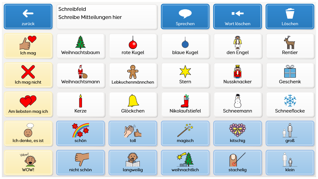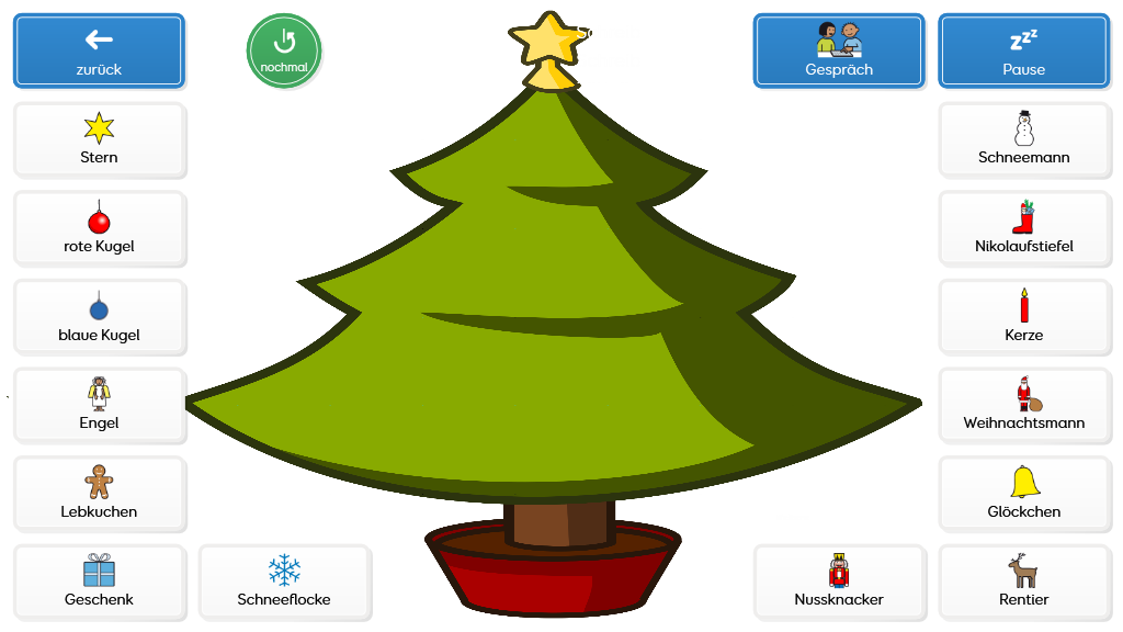 Was wäre Weihnachten ohne einen hübsch geschmückten Weihnachtsbaum. Gemeinsam macht das Schmücken gleich noch mehr Spaß. Mit unserer weihnachtlichen Spielidee für Grid 3 und Grid for iPad lässt sich der Weihnachtsbaum immer wieder aufs Neue kreativ mit verschiedenen Gegenständen verschönern. Ebenfalls haben wir ein Seitenset mit Aussagen zum Thema vorbereitet, schließlich darf nach dem Schmücken das Gespräch über das Resultat nicht fehlen.