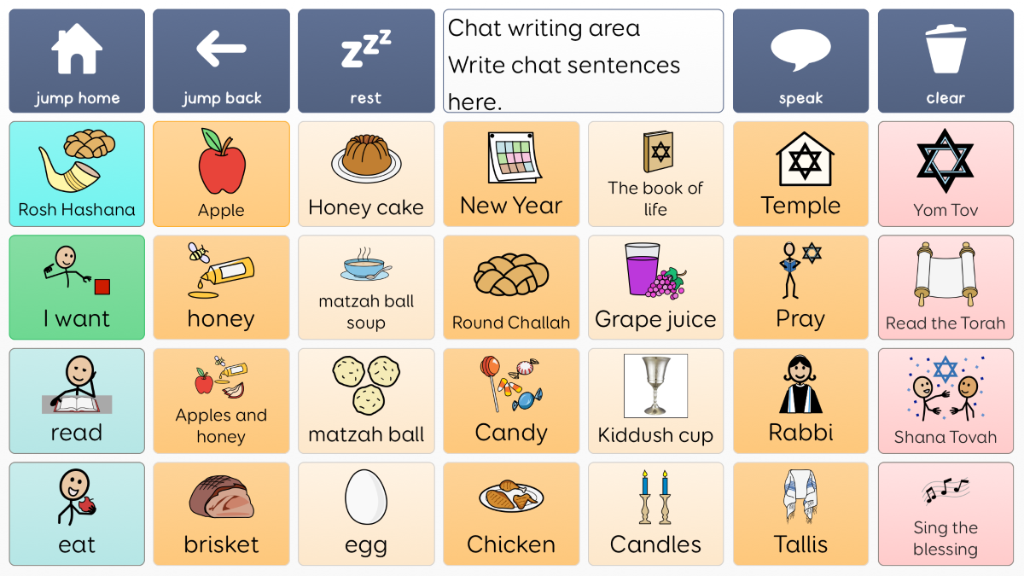 A page with key words for the Jewish New Year, Rosh Hashana. Page includes food associated with the Jewish New Year, as well as Jewish rituals such as praying, lighting candles, and attending High Holiday services.