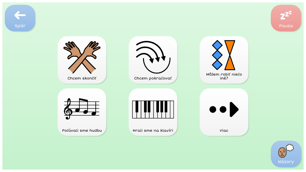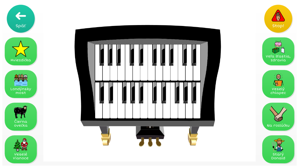 Vypočuj si prekné pesničky, ktoré hrá kúzelný klavír. Táto sada mriežok pomáha rozvíjať porozumenie princípu príčiny a následku. Aktivity Interaktívneho učenia sú vytvorené tak, aby pri výučbe kľúčových zručností motivovali a prinášali zábavu. Súčasťou sady sú tiež mriežky určené ku konverzácii, ktoré umožňujú rozhovor o aktivite a pomáhajú tak k rozvoju alternatívnej komunikácie. v.4.25