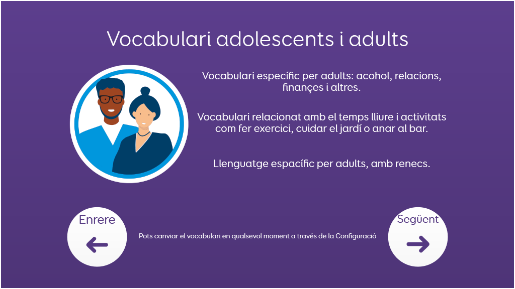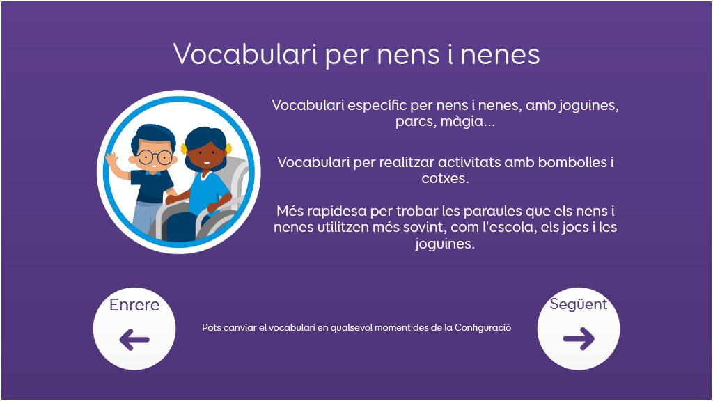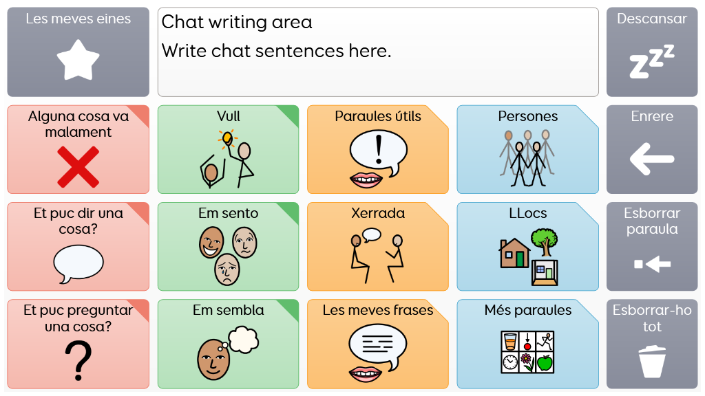 Voco Chat és un vocabulari de símbols amb un format de cel·les reduït, dissenyat perquè els usuaris es comuniquin per diverses raons. Les progressions de missatges, amb salts incorporats i vocabulari seleccionats amb cura, ofereixen un suport al llenguatge, i el paquet de quadrícules inclou recursos per promoure la comunicació i el benestar emocional, a més d'aplicacions com Symoji i Càmera que faciliten la interacció i la motivació. Voco Chat és adequat per a qualsevol persona que necessiti cel·les més grans i es pot utilitzar amb pantalla tàctil, mirada, punter i commutadors. Inclou indicacions auditives tant per a columnes com per a cel·les individuals. La primera vegada que obres Voco Chat pots seleccionar "Infantil" o "Adolescent i adult" per triar el vocabulari més apropiat per a l'usuari. v1.05