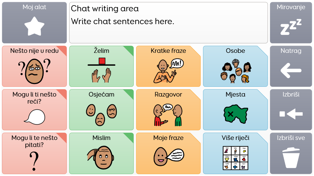 Voco Chat je rječnik simbola s malim brojem ćelija, osmišljen kako bi korisnicima omogućio komunikaciju iz širokog niza razloga. Putovi sintetiziranja poruka, s ugrađenim skokovima i pažljivo odabranim rječnikom, pružaju potpomognut pristup jeziku. Skup grid-ova sadržava resurse za potporu komunikaciji i emocionalnom blagostanju, s aplikacijama kao što su Symoji i Fotoaparat za potporu interakciji i angažmanu. Voco Chat je prikladan za sve koji trebaju veće ćelije, a može se koristiti dodirom, pogledom, pokazivačem i prekidačima. Glasovna pomoć je uključena i za stupce i za pojedinačne ćelije. Kada prvi put dodate Voco Chat, možete odabrati ‘Dijete’ ili ‘Tinejdžer i odrasli’ kako biste odabrali najprikladniji rječnik za korisnika. v1.07