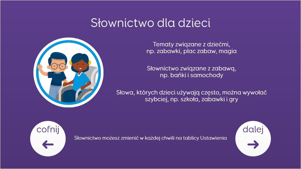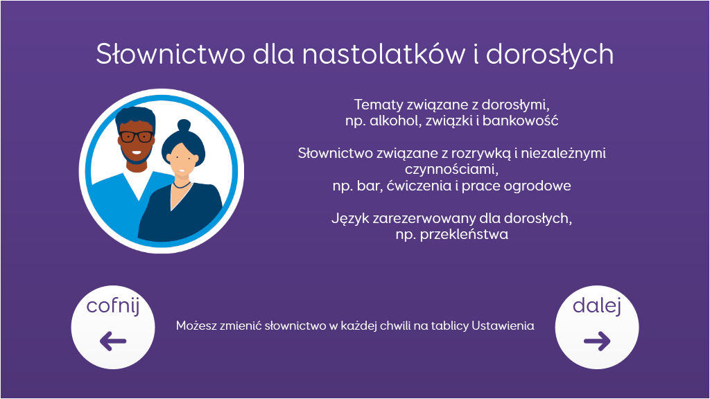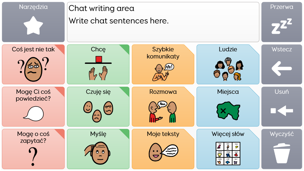 Voco Chat to słownik symboli o małej liczbie komórek, zaprojektowany tak, aby umożliwiać użytkownikom komunikację w różnych sytuacjach życiowych. Ścieżki komunikacyjne, z wbudowanymi skokami i starannie dobranym słownictwem, zapewniają wsparcie w kwestiach językowych. Zestaw tablic zawiera zasoby wspierające komunikację i dobre samopoczucie emocjonalne oraz uwzględnia takie aplikacje, jak Symoji czy aparat, aby ułatwiać użytkownikom interakcję i zaangażowanie. Słownik Voco Chat jest odpowiedni dla każdego, kto potrzebuje większych komórek. Do obsługi można użyć dotyku, spojrzenia, wskaźnika lub przełączników. Kolumny i pojedyncze komórki zawierają podpowiedzi dźwiękowe. Po dodaniu słownika Voco Chat po raz pierwszy można wybrać wersję dla dzieci lub dla nastolatków i dorosłych, aby dopasować słownictwo do użytkownika. v1.05