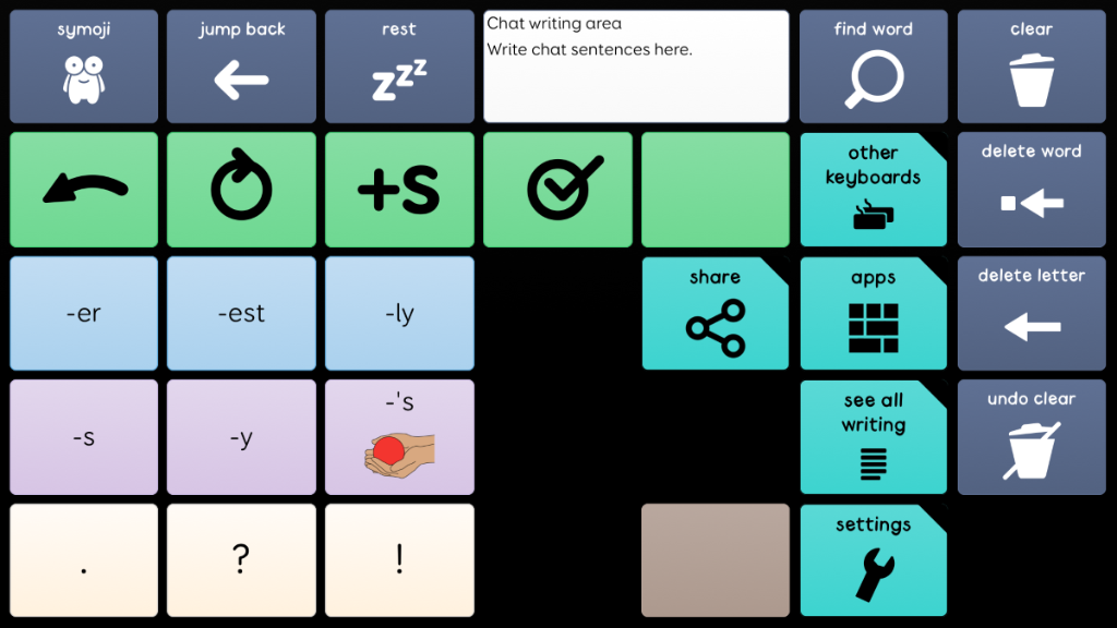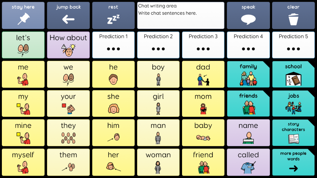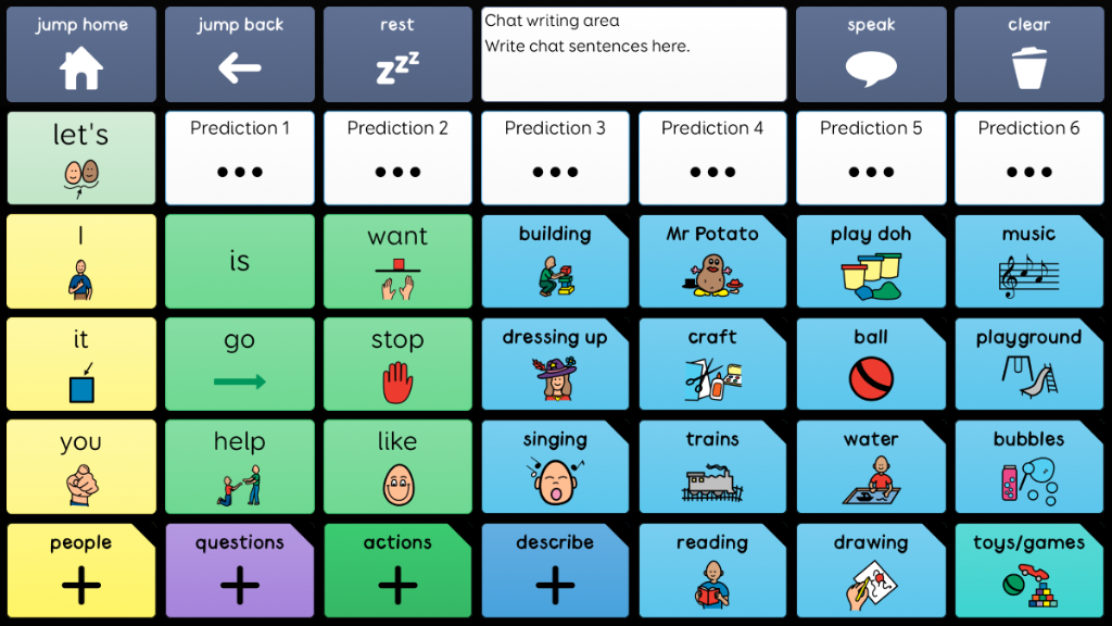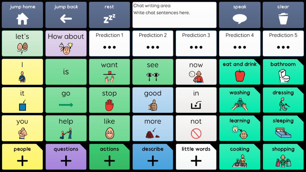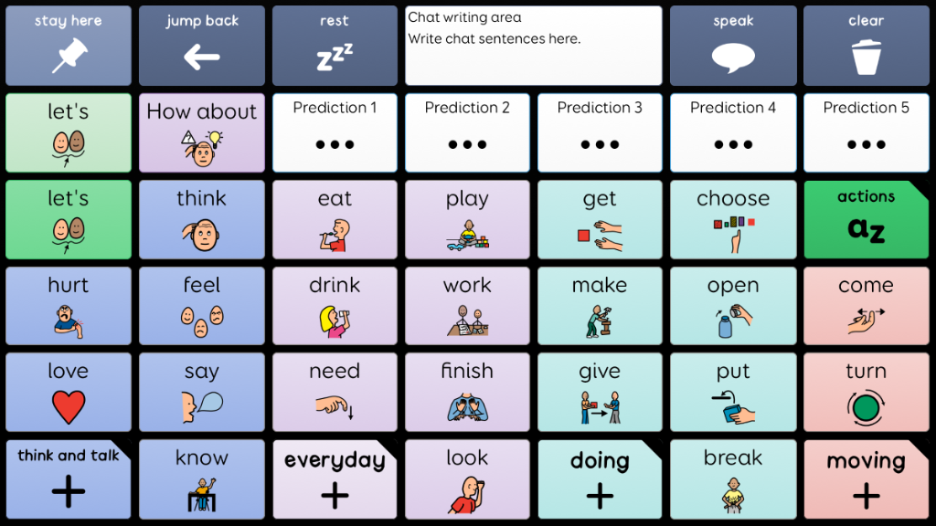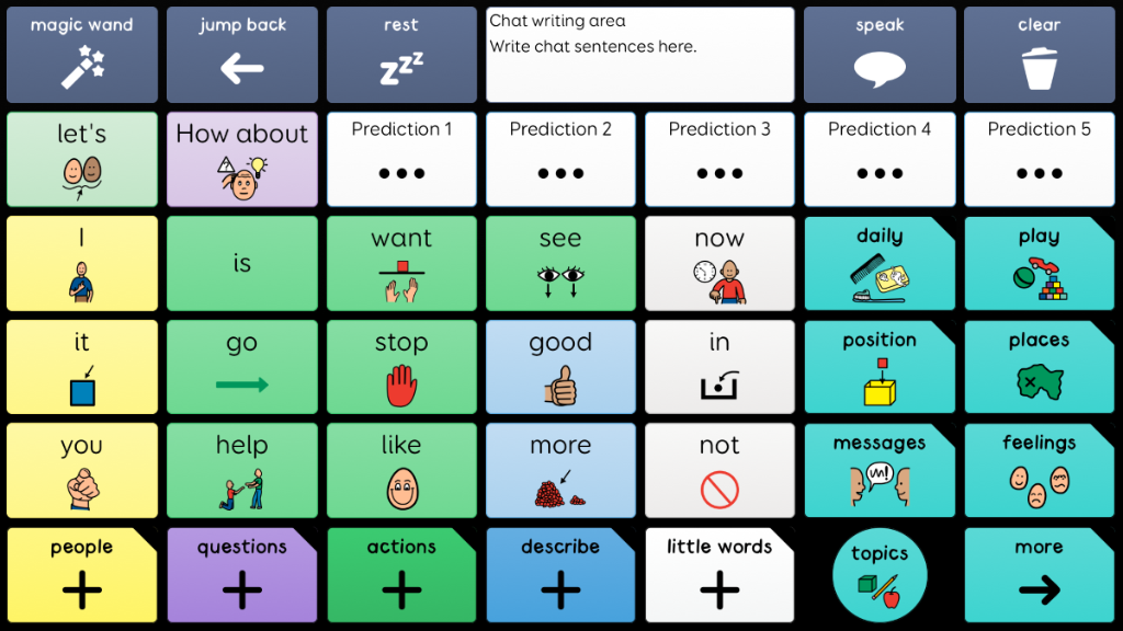 Supercore 30 pcs adapted to include a predictive row at the top of each page. Intended to be customized per user using word lists. Version 2.07