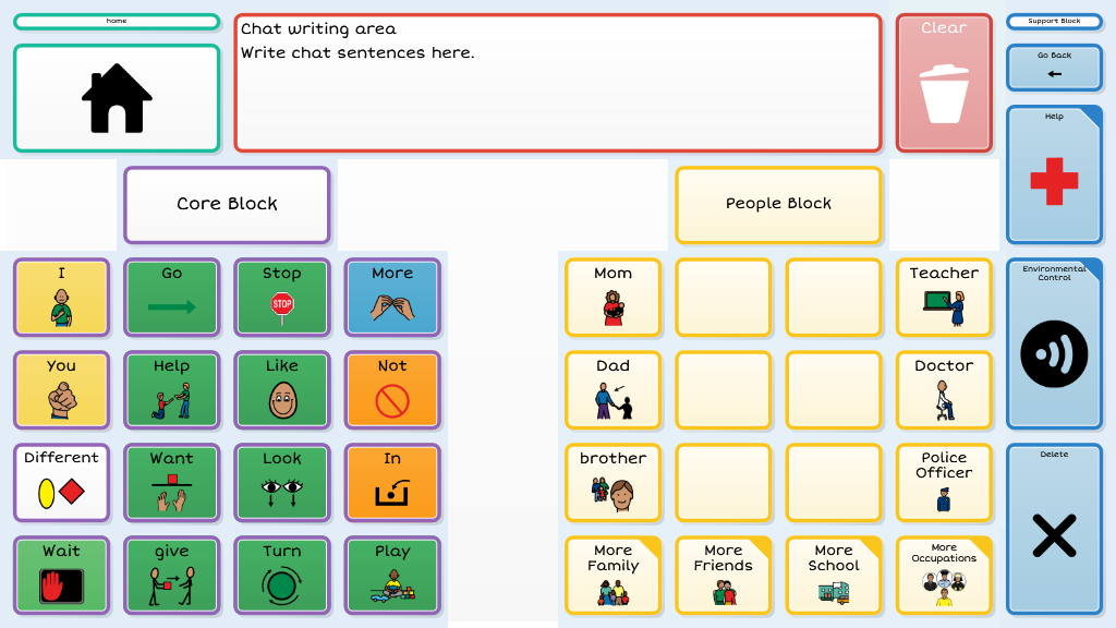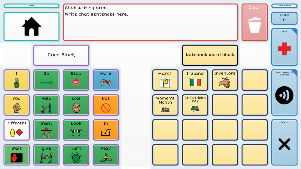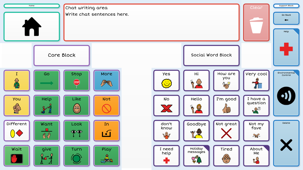 Level 3 introduces more independent access to a robust vocabulary by making scanning available to all four columns within a block. Dynamic navigation throughout the page set continues as the available vocabulary increases. To navigate to alternate vocabulary within the 4th and 5th block requires cells to be activated by touch.