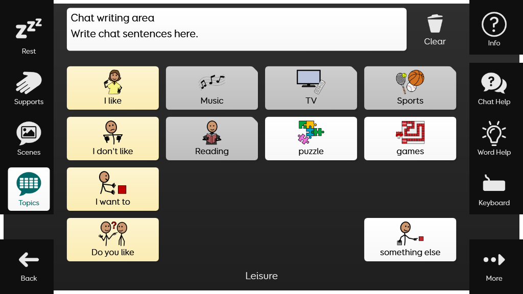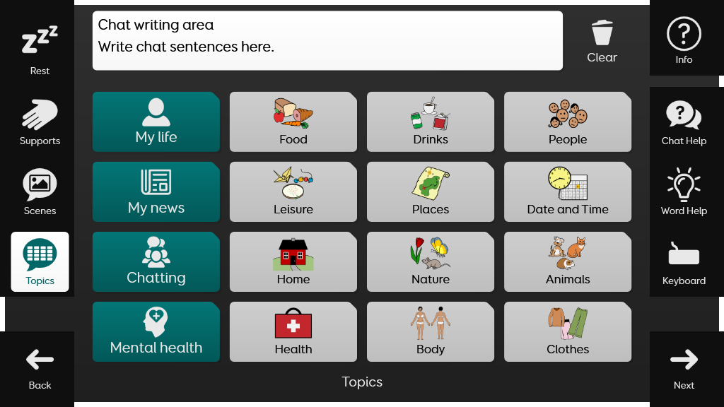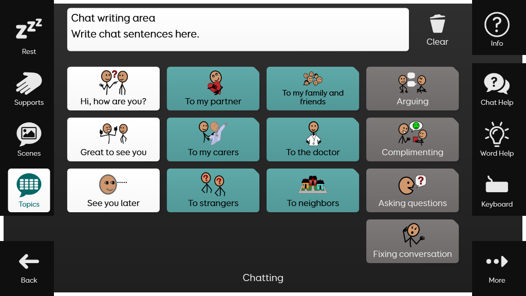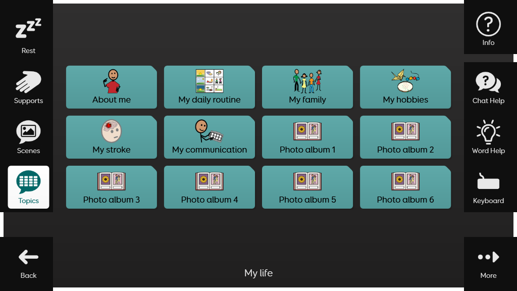 EDITED-KEYBOARD-(NO SOUNDS)Aphasia Duo has been created for adults who have aphasia, who would benefit from a symbol supported vocabulary. Its aim is to enable people with aphasia to communicate for a wide range of reasons, with help from a range of communication supports. Aphasia Duo 16 may be better suited to those with less severe language, cognitive, visual or physical difficulties, or for individuals where word finding is their main difficulty. It includes tools to support word finding, such as picture dictionaries and a word bank. Aphasia Duo is compatible with keyguards, and can be used with any access method. v1.3 Note: This grid set requires Grid v94 or above Laken-DEMO-Cook-ADULT REHABS