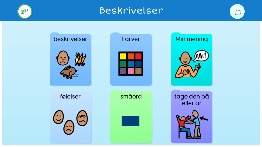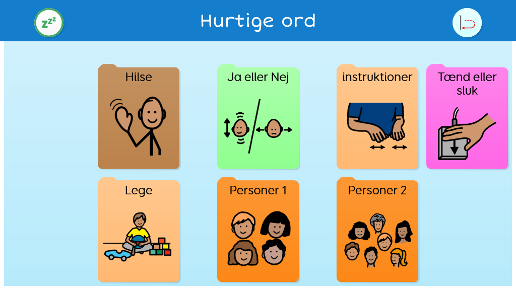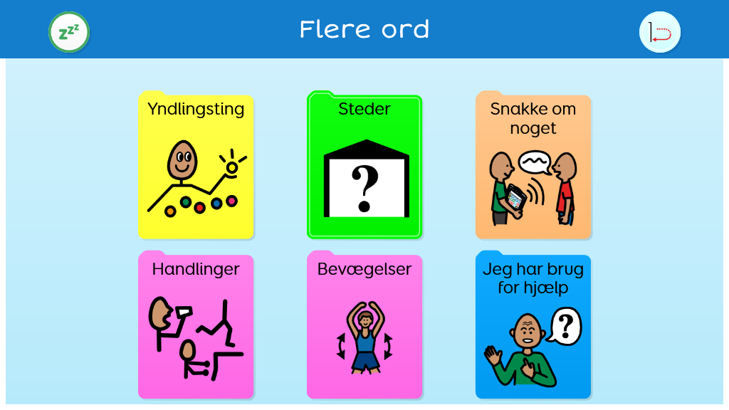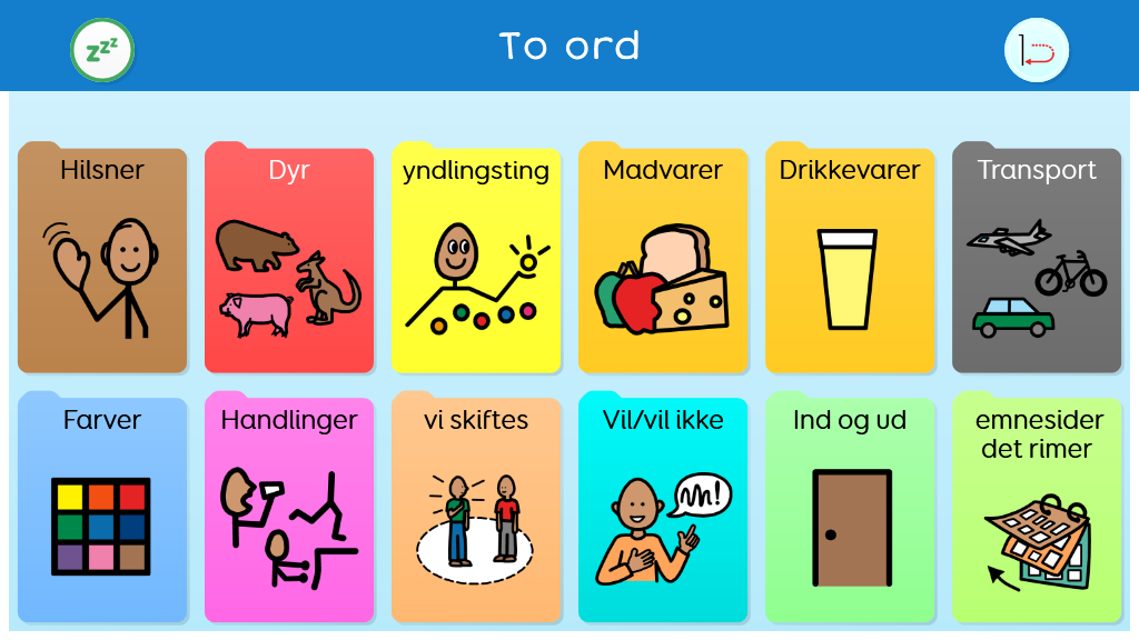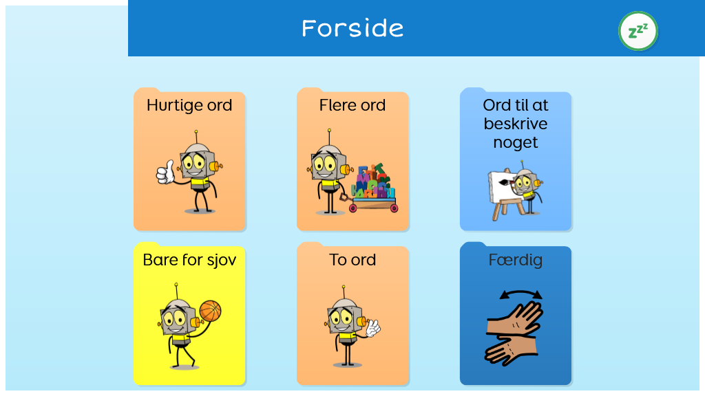 Dette sidesæt er et leg- og læringssidesæt. Opringeligt hedder det "first words" med reference til det at lære sine første ord og symboler og betydningen af disse. Der er ikke tænkt nogen rækkefølge i indlæring af ordene, men barnet eller den unges motivation skal være drivkraft. Denne version er tilpasset farvekodningen i PODD. Der er forskellige ordkategorier og under hver kategori kam man udforske forskellige ord. Brugeren kan klikke på et ord, høre betydningen og se Robert udføre meningen som en animation ved siden af. Antallet af felter varierer på siderne, men disse er relativt store. Sidesættet kan bruges med alle betjeningsformer. OBS. animationerne kan nogle gange have lidt svært ved at starte, her hjælper det at forlade siden og gå ind igen eller lukke grid og åbne igen.