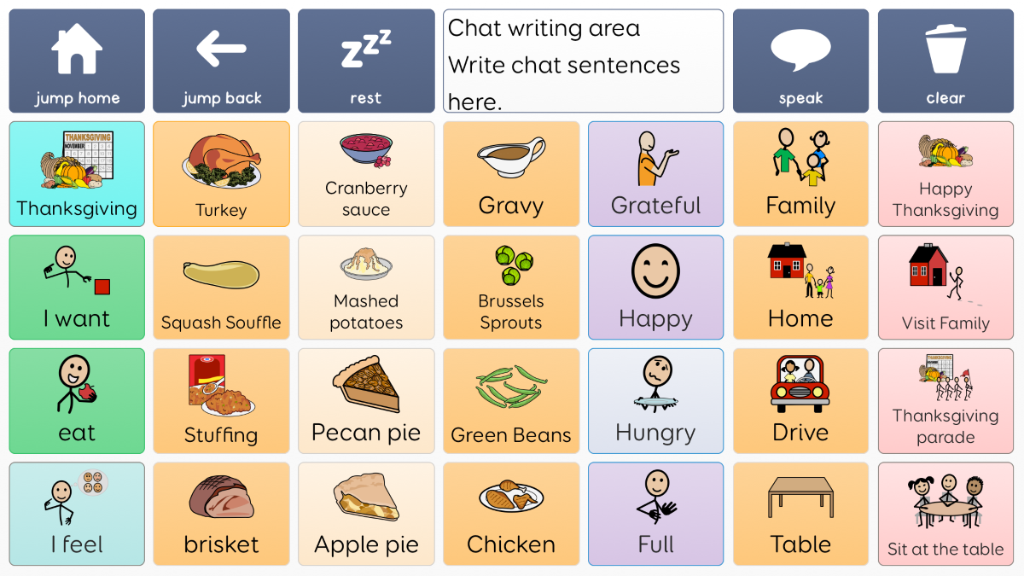 A Thanksgiving page for Super Core 30. This page can be added to the grid set by navigating to Topics, Celebration, more celebration, and linking this page set to the Thanksgiving button. Page includes many Thanksgiving foods, several “feelings” (grateful, hungry, full), and some phrases associated with the holiday.