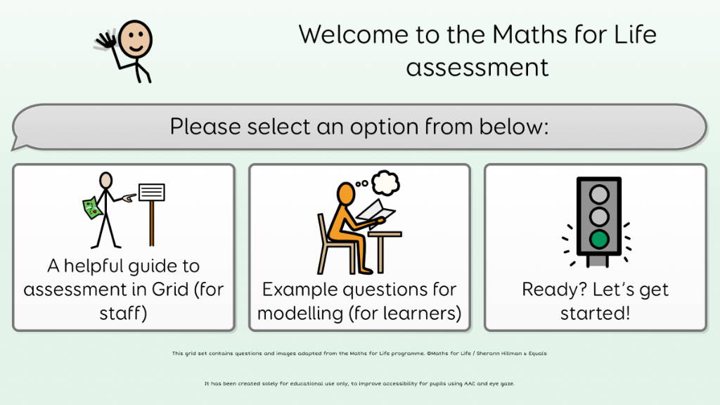 This Grid set is an accessibility-adapted version of Level 1 assessment (L1A001) from the Maths for Life programme. It has been created to support pupils who use AAC, eye gaze or alternative access methods to engage with the assessment content in a meaningful way. This resource includes adapted wording and images from Maths for Life. © Maths for Life / Equals / Sherann Hillman. This Grid set is shared for noncommercial educational use only. Please ensure that your school or setting holds a license or purchased copy of Maths for Life before using this material.