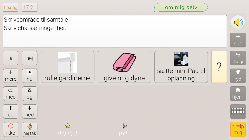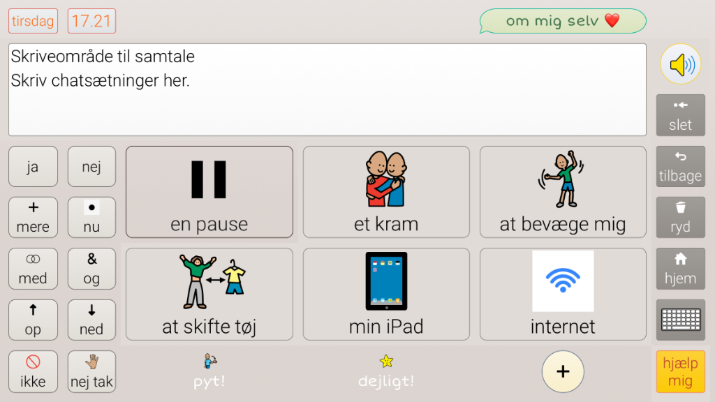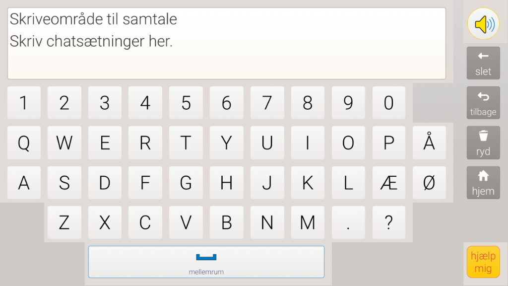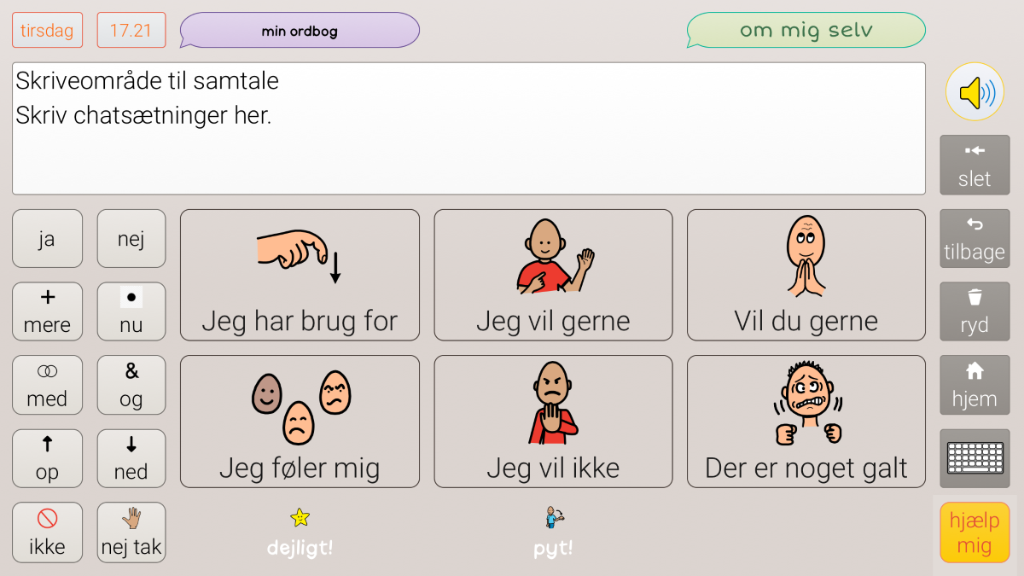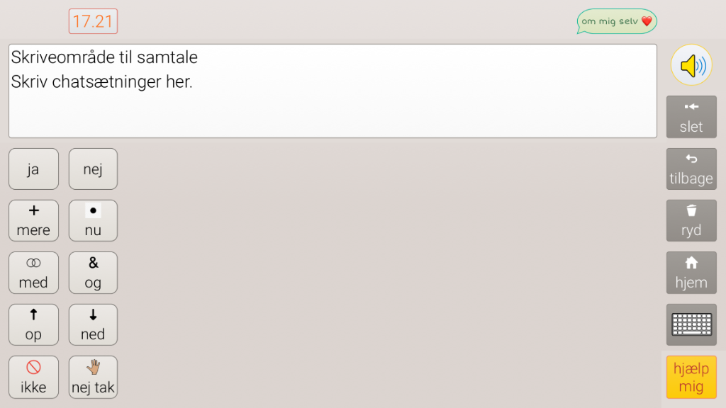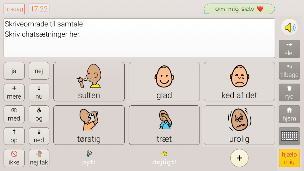 Voco Chat er et symbol ordforråd med få celler på hver side, designet til at muliggøre en bedre kommunikation til ASK-brugerne i mange forskellige henseender. System til opbyggelse af sætninger, med indbyggede genveje og nøje udvalgte ordforråd, understøtter en god kommunikation. Grid layoutet indeholder apps såsom Symoji og Kamera, til at understøtte kommunikationen, den følelsesmæssige tilstand, interaktion og engagement. Voco Chat er velegnet for de brugere som har behov for større celler, og kan betjenes ved hjælp af tryk, øjenstyring, hovedmus og 0-1 kontakter. Auditiv scanning er inkluderet for både kolonner og de individuelle celler. Når du henter Voco Chat for første gang, skal du vælge mellem "Barn" eller "Ung eller Voksen", for at få det mest passende ordforråd for brugeren. v1.04