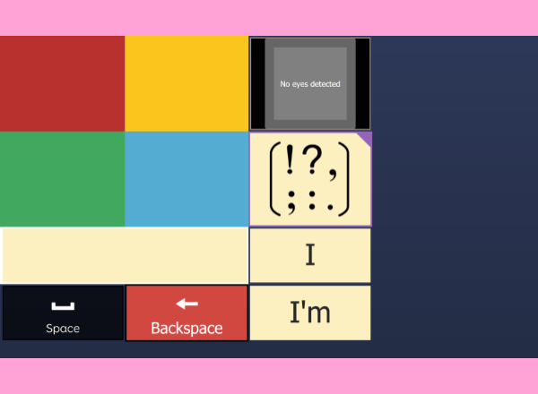 A two-hit 12 cell keyboard grid, with large targets and large font. Contains alphabet, numbers, punctuation, prediction cells and two message pages, which the user is able to add/remove messages from. Suitable for eye gaze.
