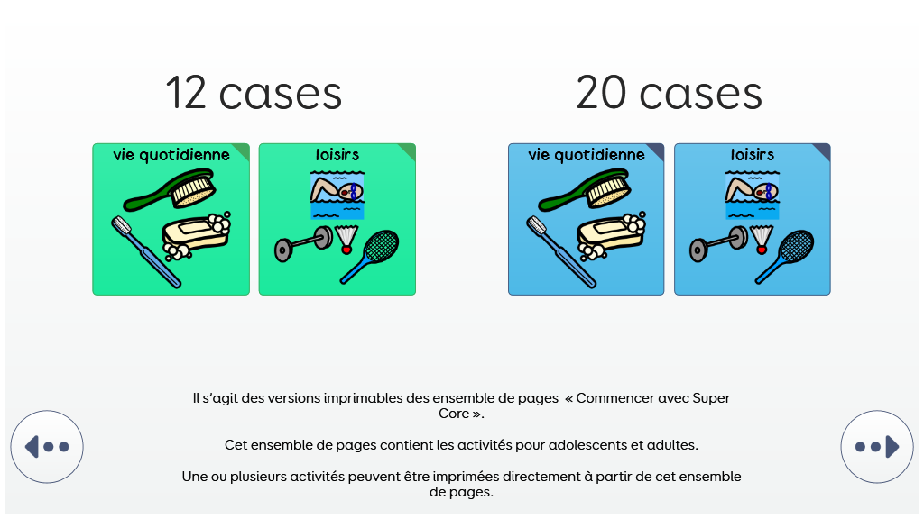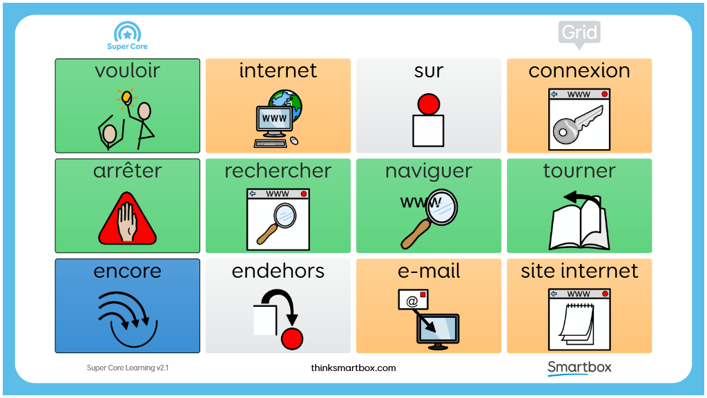 Les grilles d'apprentissage Super Core offrent une progression en douceur vers le vocabulaire complet des symboles Super Core et une opportunité de renforcer la confiance avec les symboles CAA. Ils incluent tout le vocabulaire quotidien et d'activités de jeu de Super Core, ainsi qu'un vocabulaire de base simplifié avec un nombre de cellules de 12 et 20. v2.1
